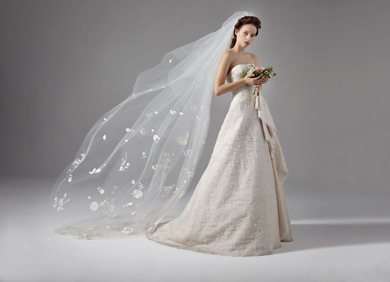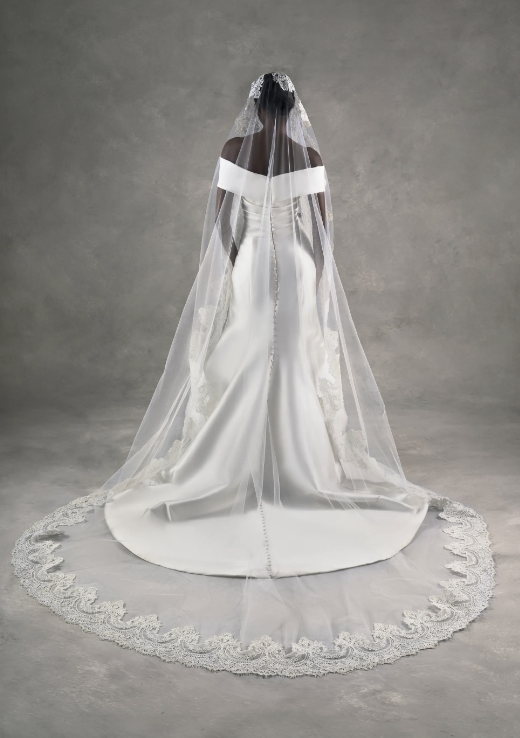 Cathedral veils are long and dramatic, extending several feet behind the bride. Perfect for grand entrances, they make a powerful style statement for formal weddings. This length is ideal for gowns with long trains and is often chosen for religious or large-scale events where a lasting impression is desired. Cathedral veils offer opportunities for elaborate designs, including hand-stitched details, intricate lace, and layered tulle. While glamorous, they require careful handling and often the assistance of bridesmaids or attendants to maintain their flow during the ceremony and photos.