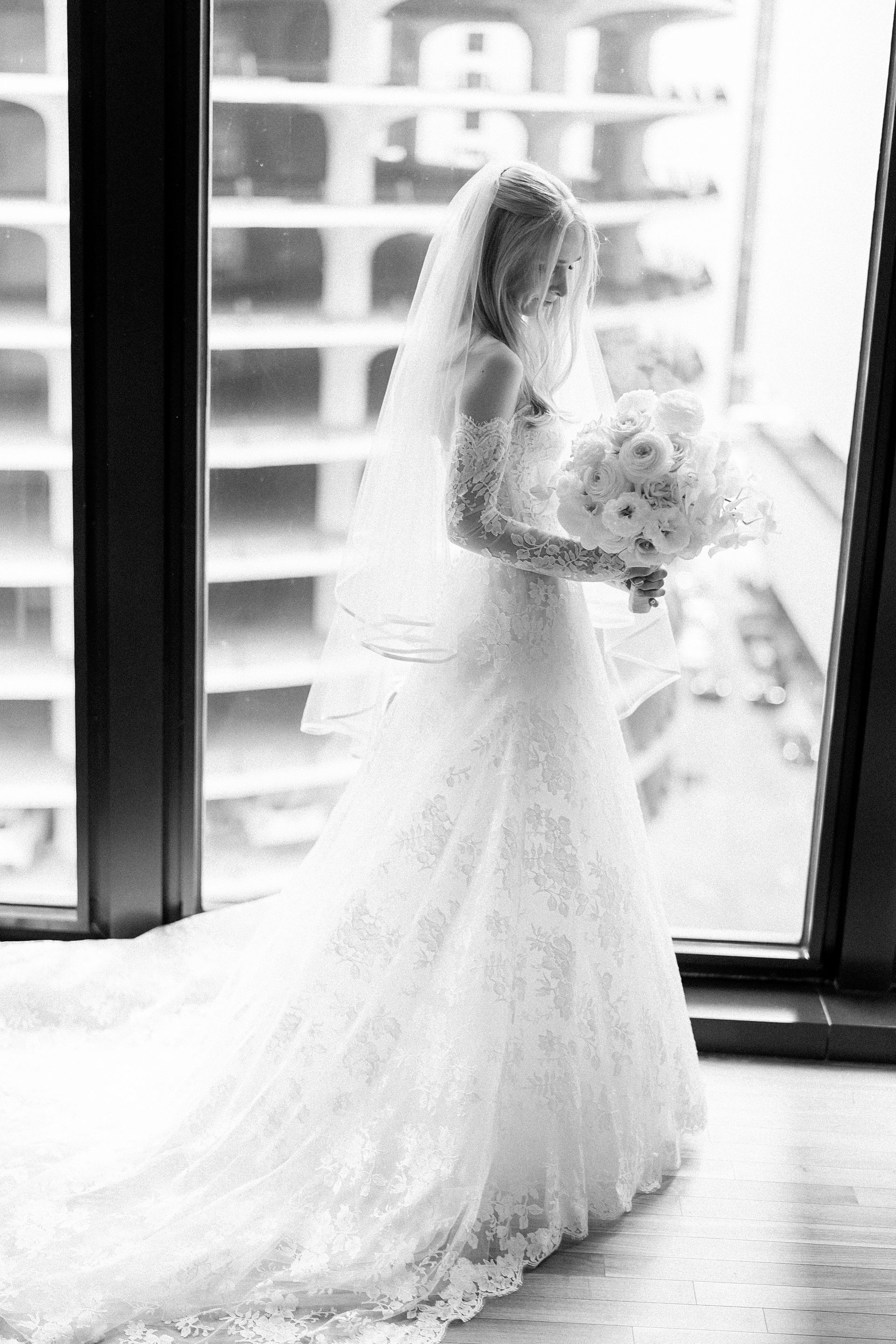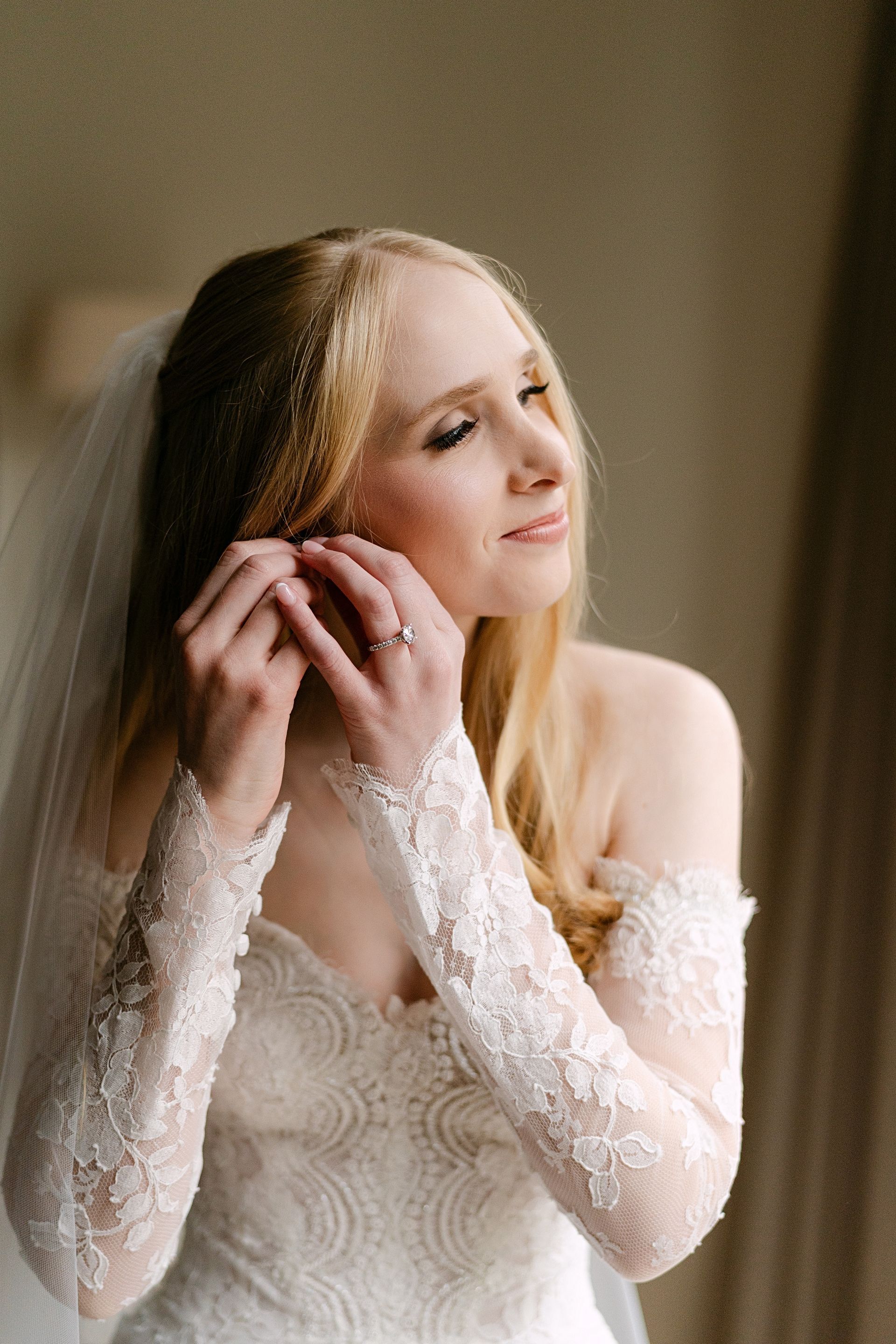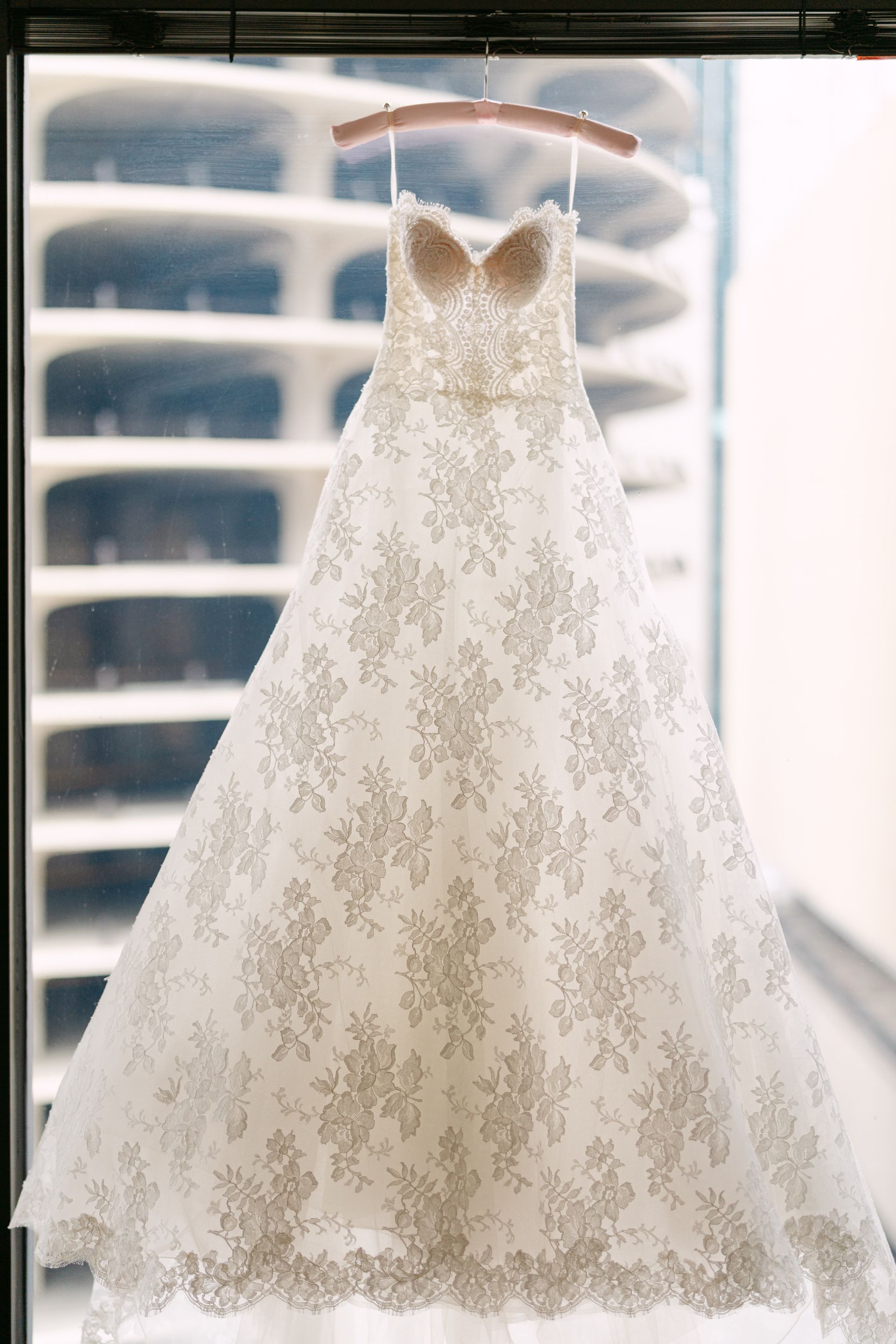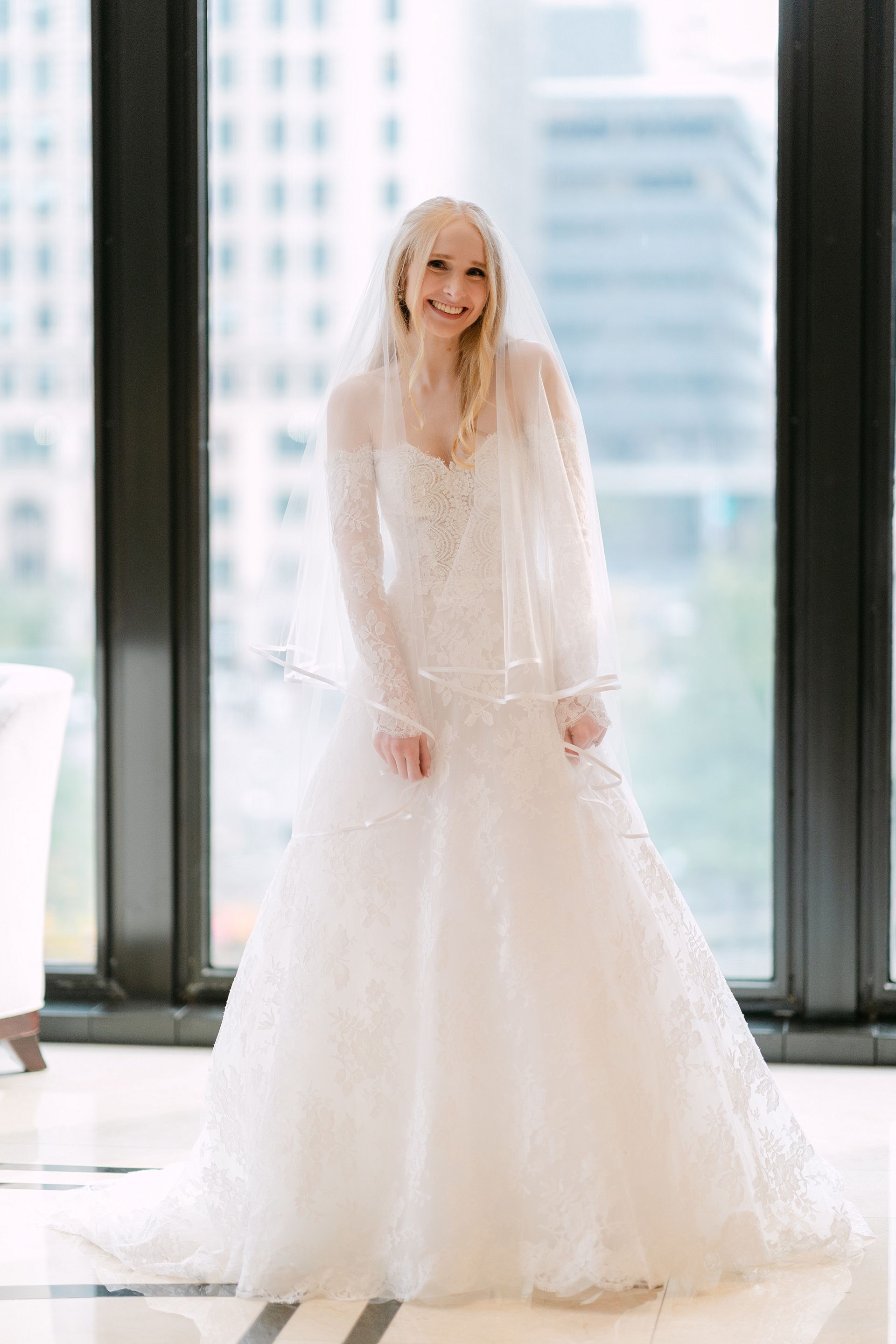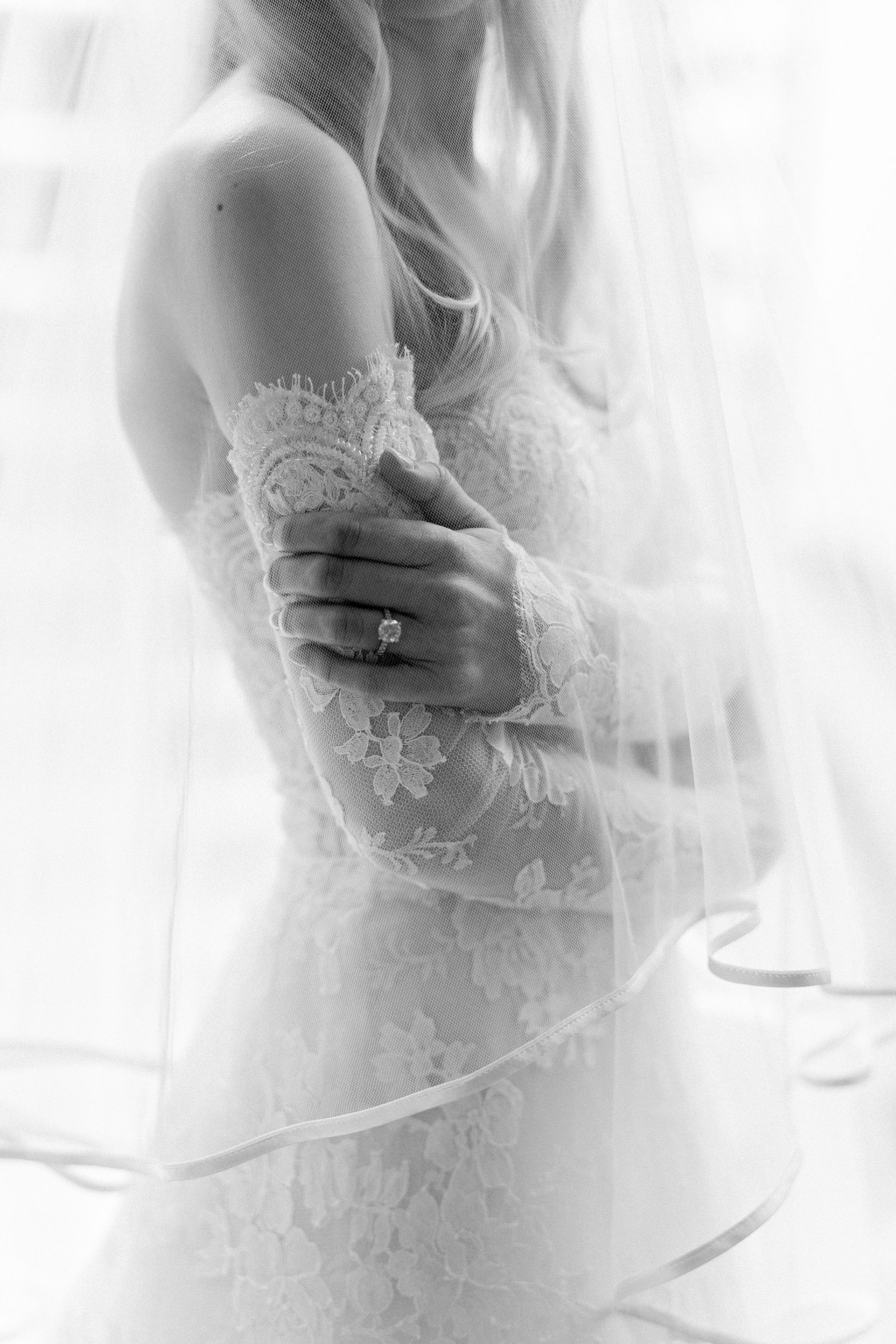 For her wedding day, Emily chose the Rosa Clara sweetheart strapless lace gown, Cambas adorned with detachable lace sleeves. Her veil was a simple satin edge circular fingertip veil. All photography courtesy of Abby Rose Photography.