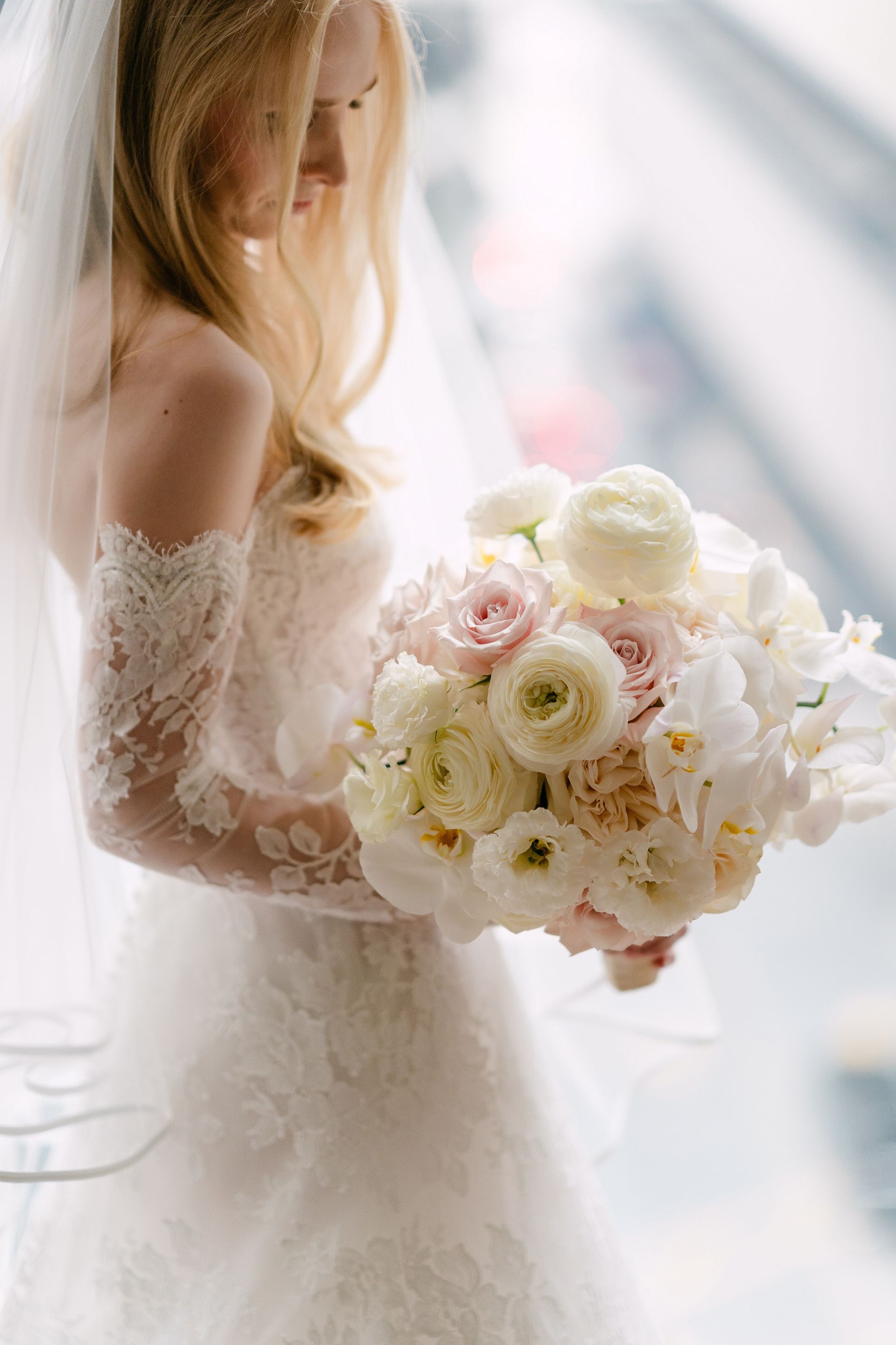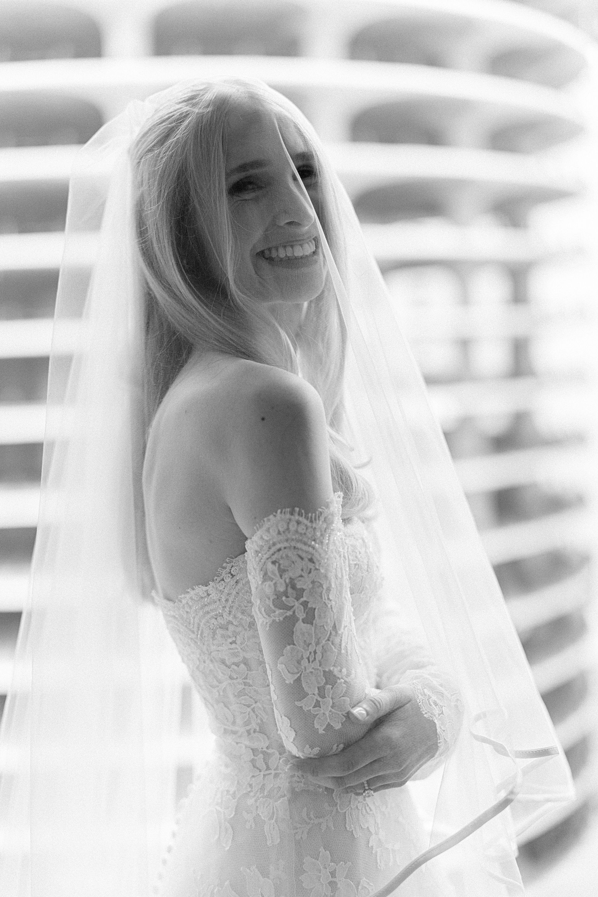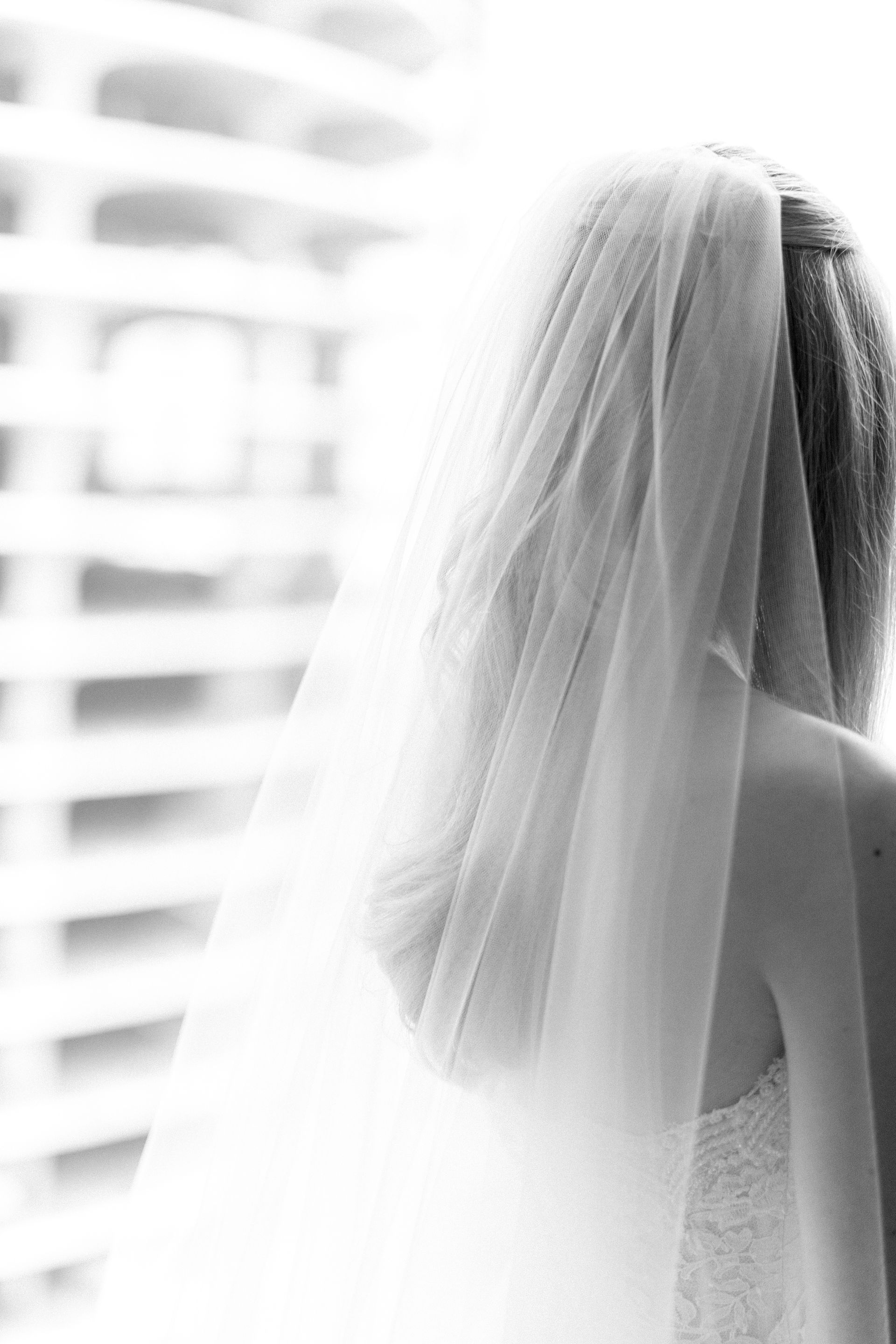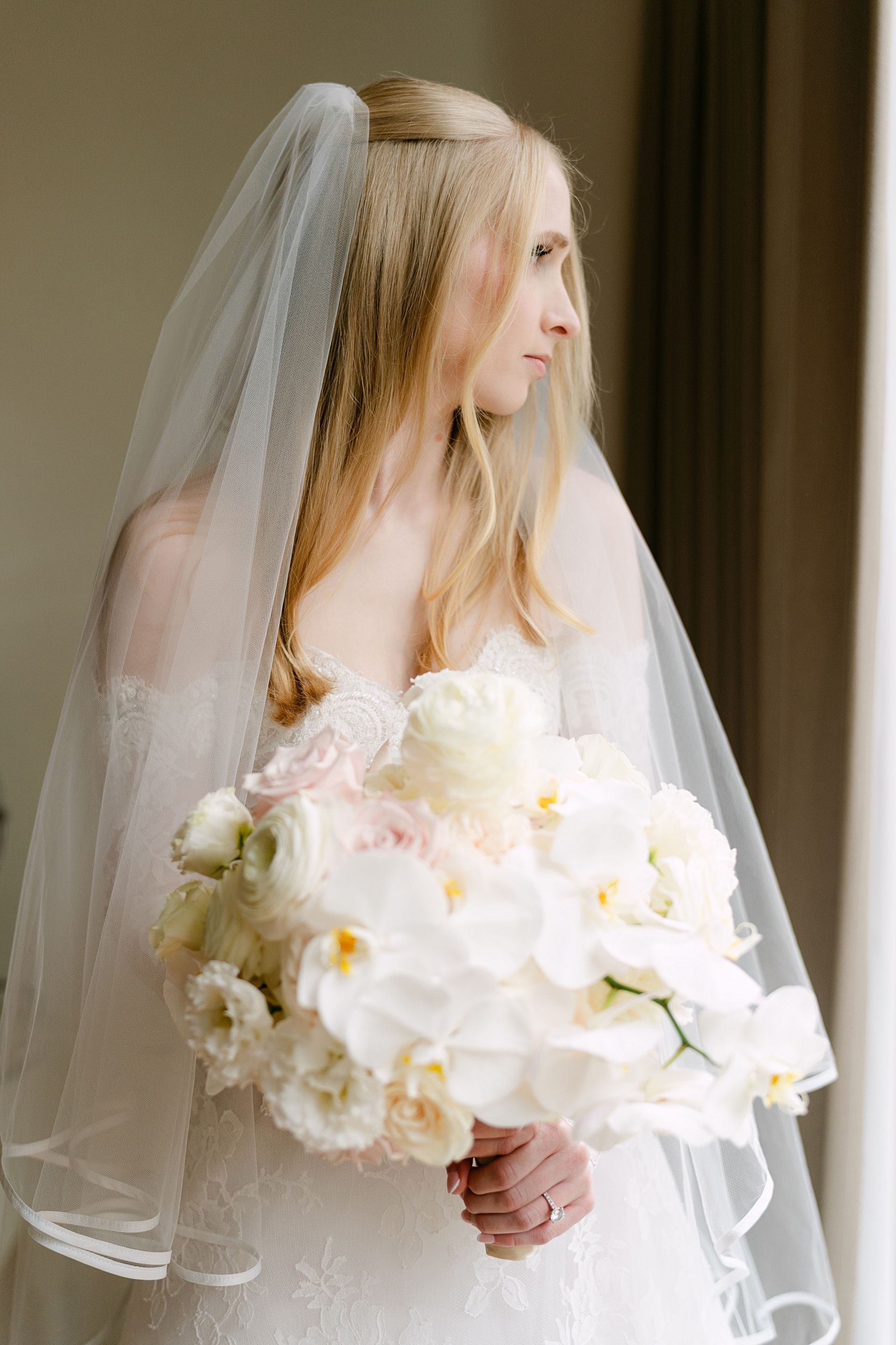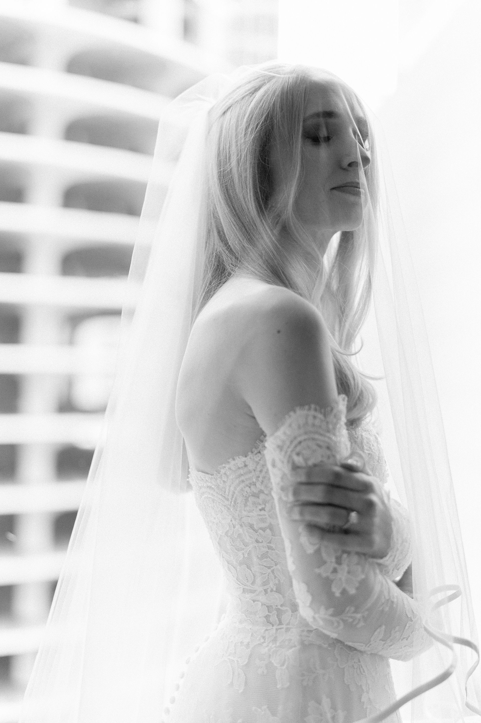 For her wedding day, Emily chose the Rosa Clara sweetheart strapless lace gown, Cambas adorned with detachable lace sleeves. Her veil was a simple satin edge circular fingertip veil. All photography courtesy of Abby Rose Photography.