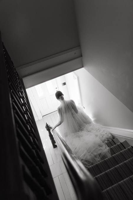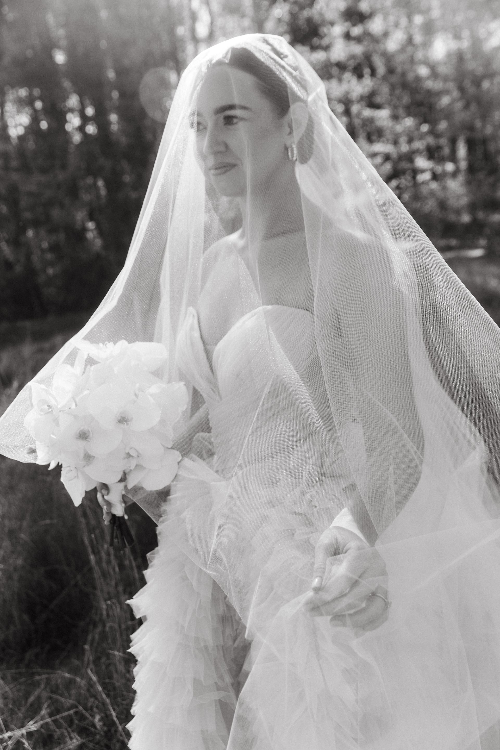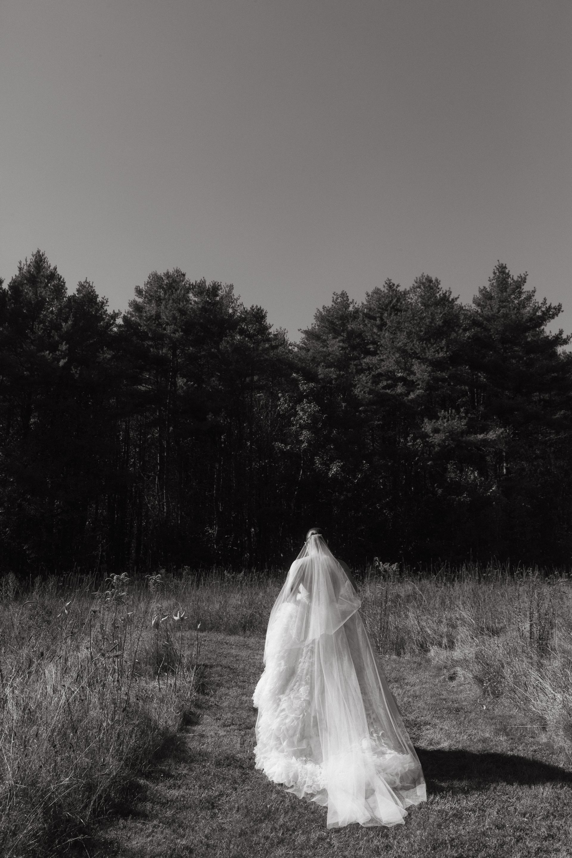“Serafina” wedding gown, and she paired it with a classic tulle veil to show the drama and beauty of her gown. All images are courtesy of Emily Delamater Photography.
