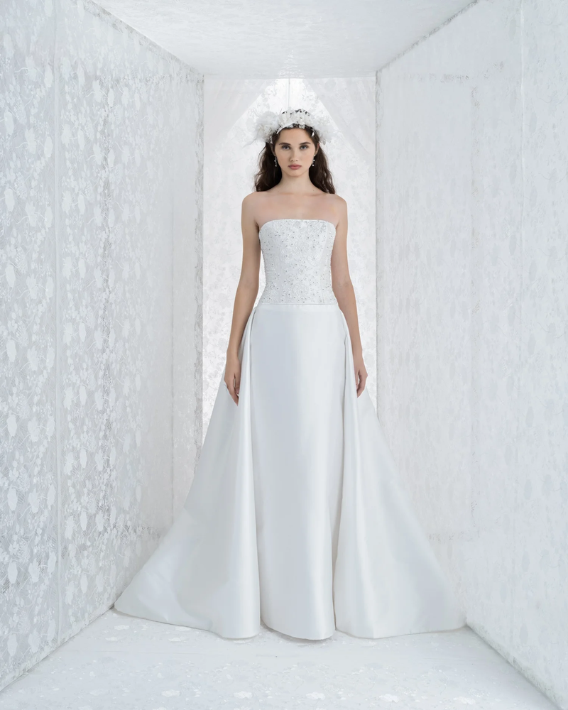 Expect flowing silhouettes, delicate lace, subtle embellishments, and modern cuts for contemporary brides.