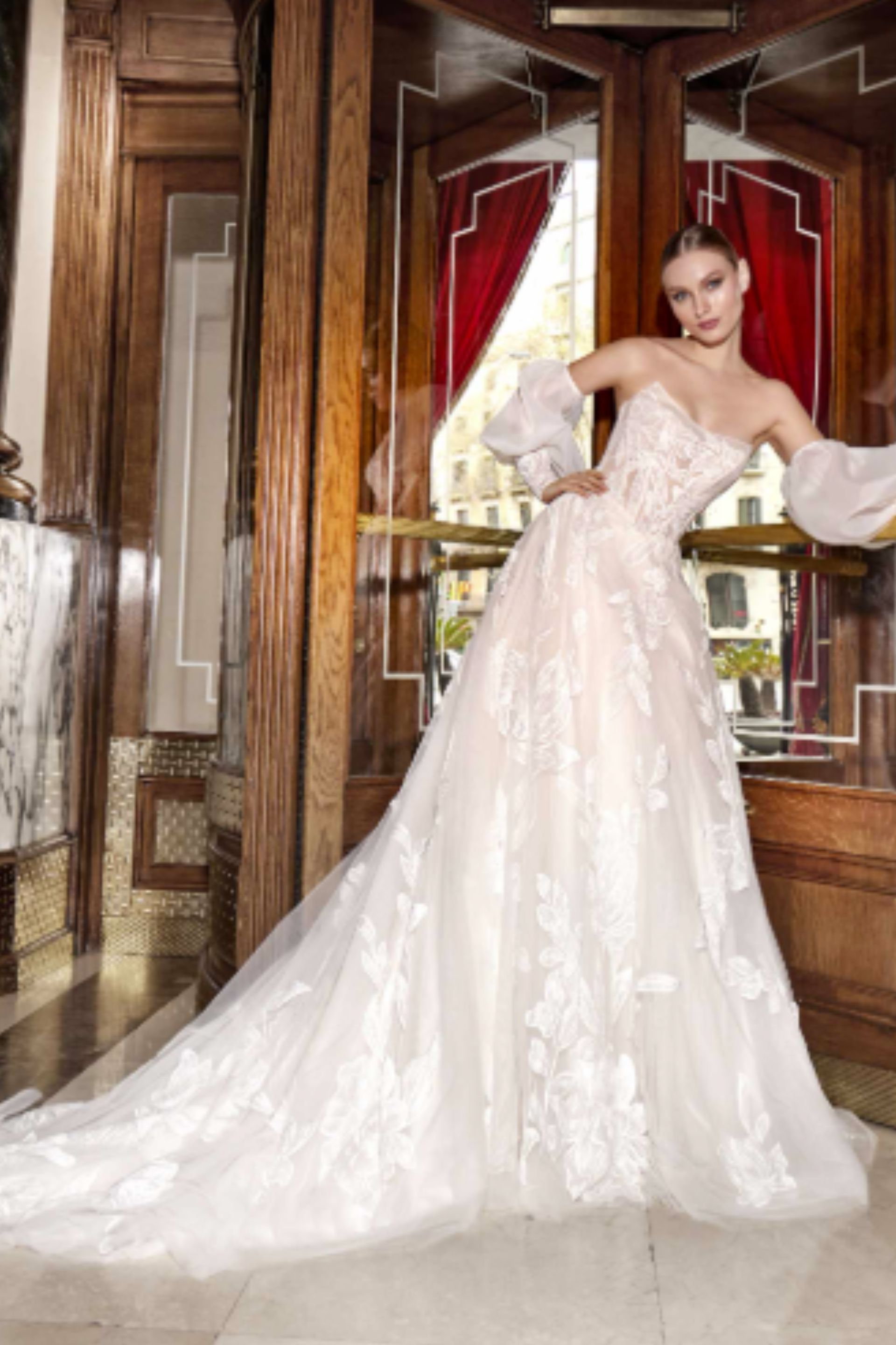 Privee wedding gowns are couture inspired line from Pronovias and is included in our Shop in Shop experience at L’elite Bridal Boston. Privee is curated for the bride looking for romantic and regal designs with modern aesthetics. Privee wedding gowns offer luxurious and dramatic silhouettes, with intricate lacework on Mikado silk, tulle, and sumptuous silks. You will find princess ballgowns, Mermaid, A-line and column gowns, with options for overskirts for added drama. These are gowns that create dramatic entrances, and bold statements for the bride who wants to make an unforgettable look on her wedding day. Privee also offers bridal attire to compliment your gown, detachable sleeves, veils, and overskirts. To experience the Shop in Shop experience schedule and appointment with one of our Bridal Stylists to find your dream gown.