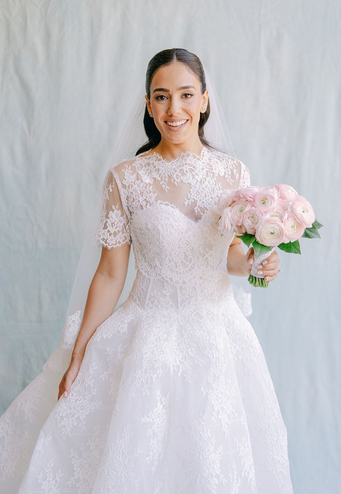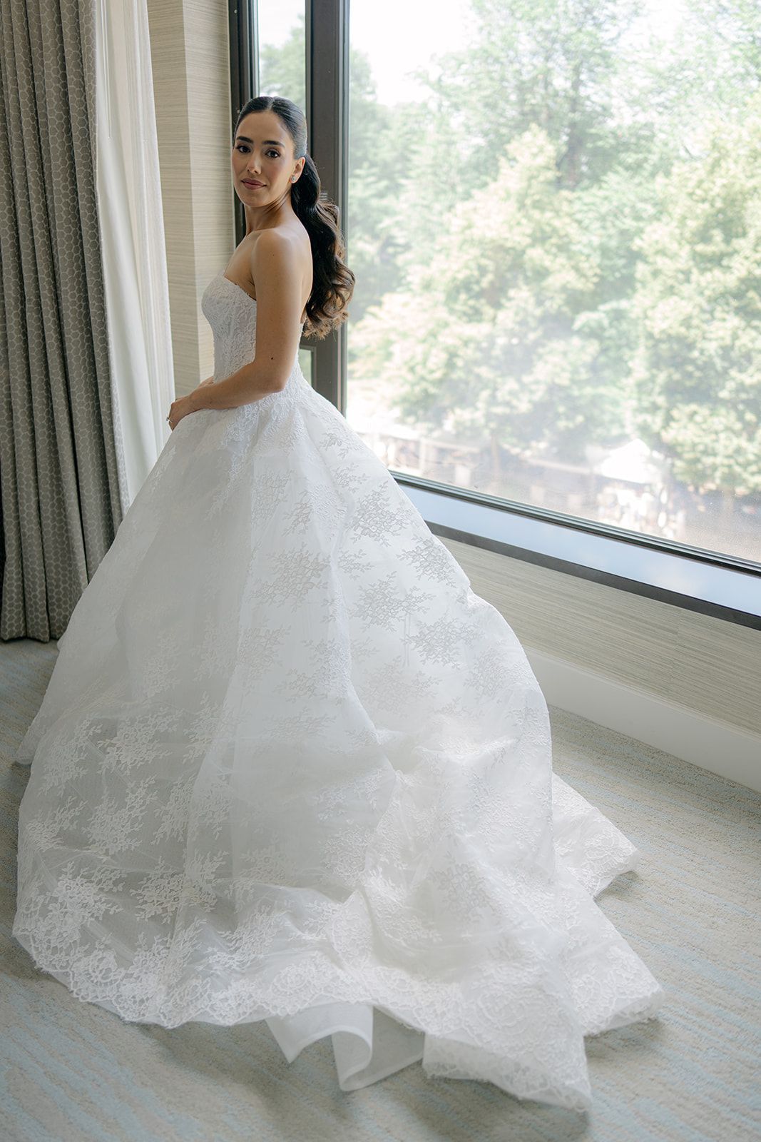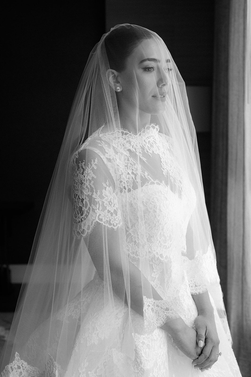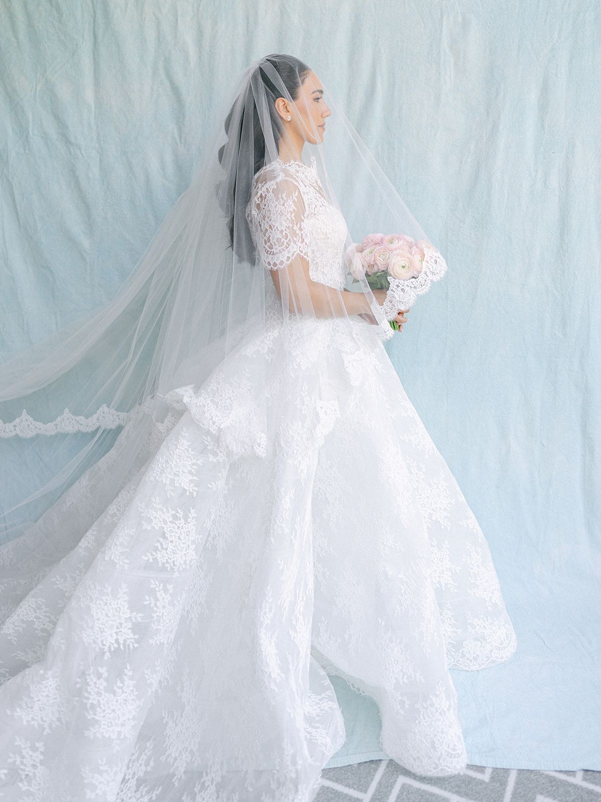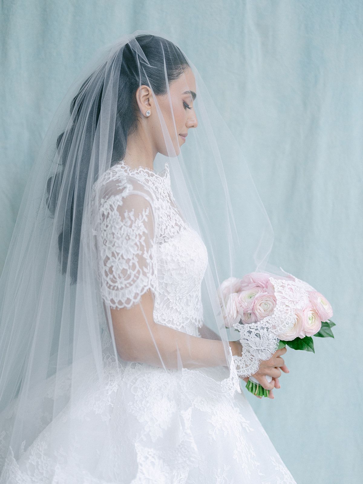 Congratulations to our gorgeous bride Sonia! Sonia chose the Monique Lhuillier strapless sweetheart lace ballgown, “Alexandra”. She opted for a custom-made matching lace jacket with button detail closure made by our L’elite Atelier. Sonia finished her look with a cathedral veil with blusher with the same lace detail. All photography is courtesy of Lisa Rigby Photography.