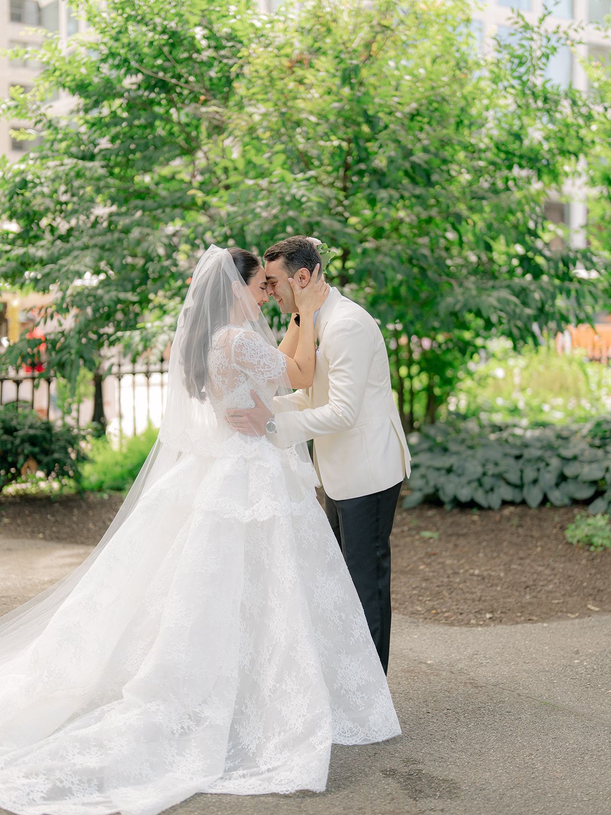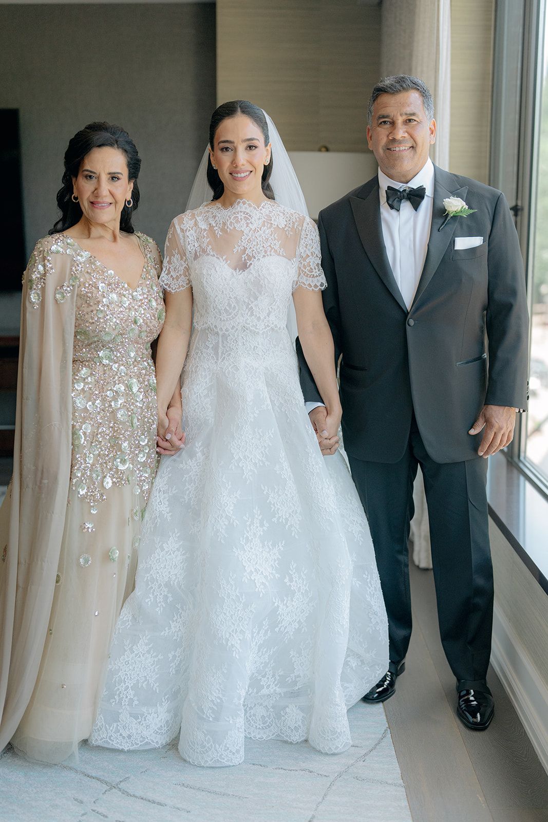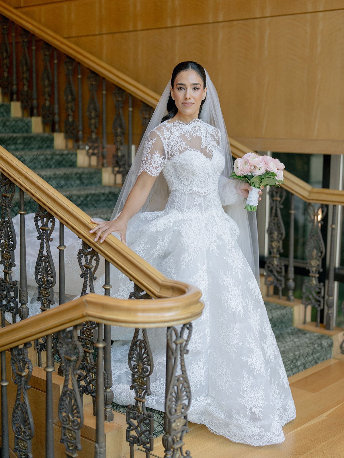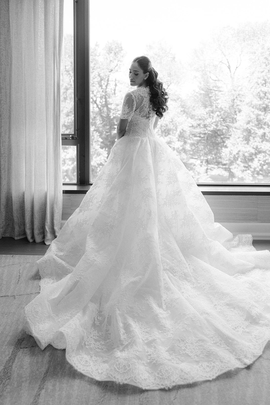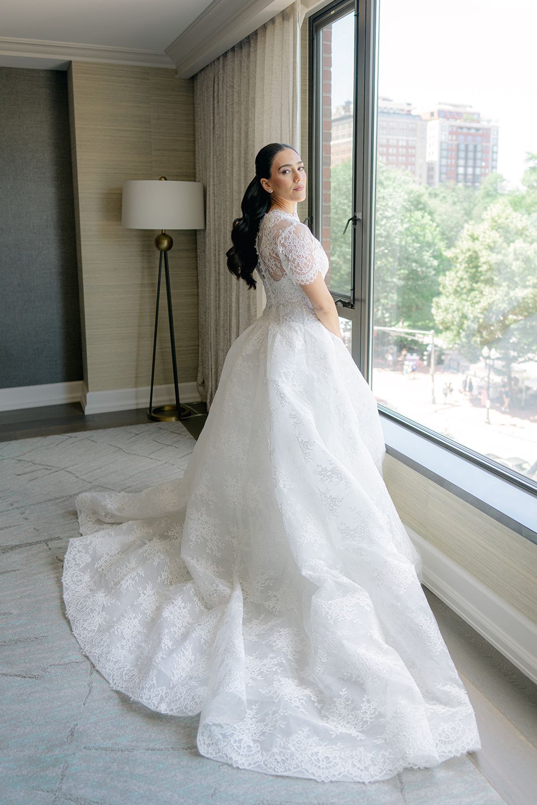 Congratulations to our gorgeous bride Sonia! Sonia chose the Monique Lhuillier strapless sweetheart lace ballgown, “Alexandra”. She opted for a custom-made matching lace jacket with button detail closure made by our L’elite Atelier. Sonia finished her look with a cathedral veil with blusher with the same lace detail. All photography is courtesy of Lisa Rigby Photography.
